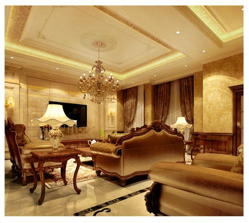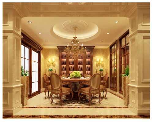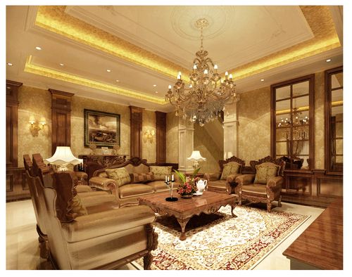 设计说明:为了迎合古典欧式风格奢华尊贵的特点,在配饰上多采用金黄色和棕色衬托出古典家具的高贵与优雅,富于古典美感的窗帘和地毯还有造型精致的吊灯使整个空间看起来极具韵律感且大方典雅,柔和的暖色花艺为整个空间带来柔美的气质,给人以开放宽容的非凡气度让人丝毫不显局促。客厅使用大面积米黄色与棕色家具,两个色系的完美搭配将整个空间从视觉上十分和谐的融合起来。对称的吊顶和背景墙面,无论从造型还是颜色上都充满华丽感,在搭配上相得益彰。